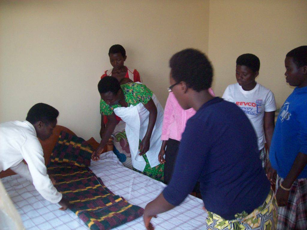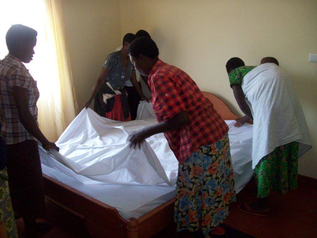 Die Schülerinnen unserer Hotellerie-Berufsschule in Kivoga beim Praxis-Unterricht. Die jungen Frauen stammen zumeist aus einfachsten Verhältnissen, und ein amtliches Bett zu machen ist für sie alles andere als alltäglich …